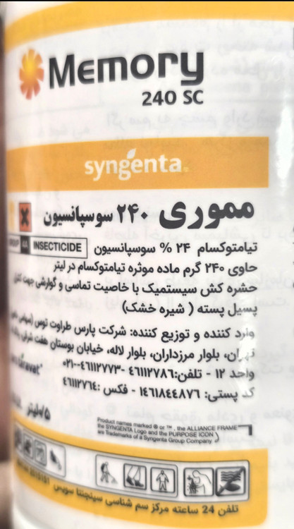مموری حاوی 240گرم در لیتر تیامتوکسام می باشد که به صورت مایع سوسپانسیونی فرموله شده است. مموری حشره کشی تماسی و گوارشی است که در گیاه به صورت سیستمیک در آمده و آفات مکنده را به راحتی کنترل می نماید.