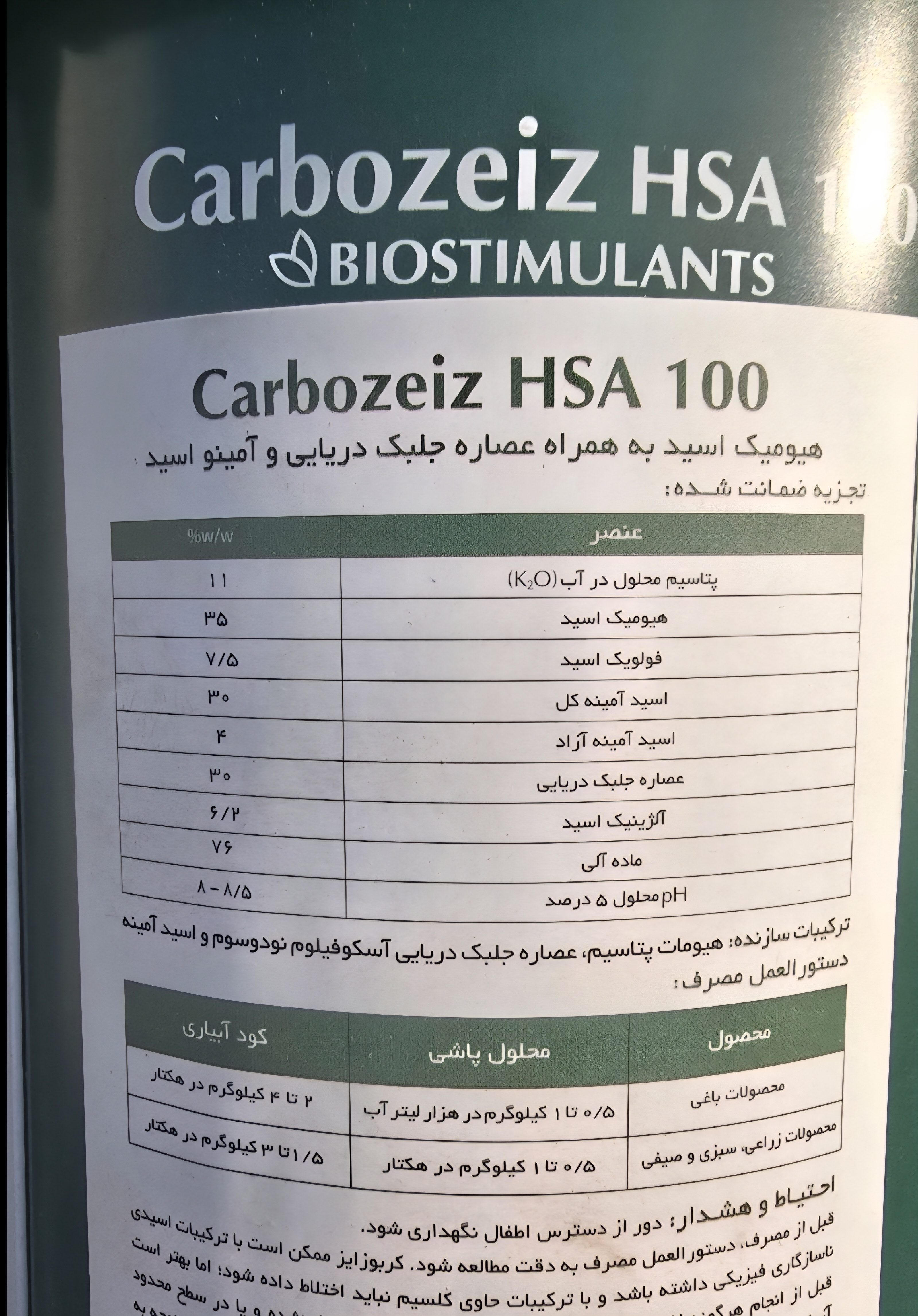 حاوی جلبک دریایی که موجب تحریک رشد گیاه و توان مقابله با تنش های زیستی و غیر زیستی می شود.